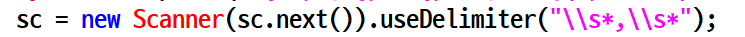 import java.util.Scanner; public class Test018 { public static void main(String[] args) { // Scnanner 인스턴스 생성 Scanner sc = new Scanner(System.in); // 주요 변수 선언 String name; int kor, eng, mat, tot; // 연산 및 처리 System.out.print("이름,국어,영어,수학 입력(',' 구분) : "); sc = new Scanner(sc.next()).useDelimiter("\\s*,\\s*"); // ----------- // 조윤상,90,80,70 name = sc.next(); //김승범 kor = sc.nextInt(); // 90 eng = sc.nextInt(); // 80 mat = sc.nextInt(); // 70 tot = kor + eng + mat; // 결과 처리 System.out.println(); System.out.println(">> 이름 : " + name); System.out.println(">> 총점 : " + tot); } }