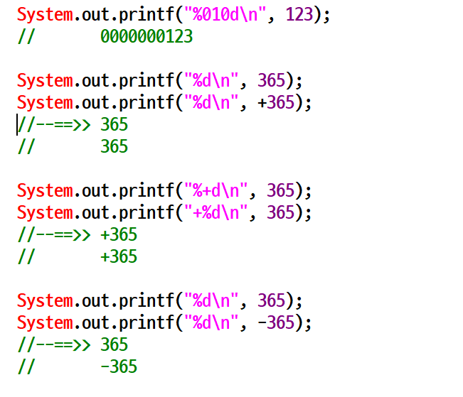 System.out.printf("%d + %d = %d\n", 10, 20, 30);